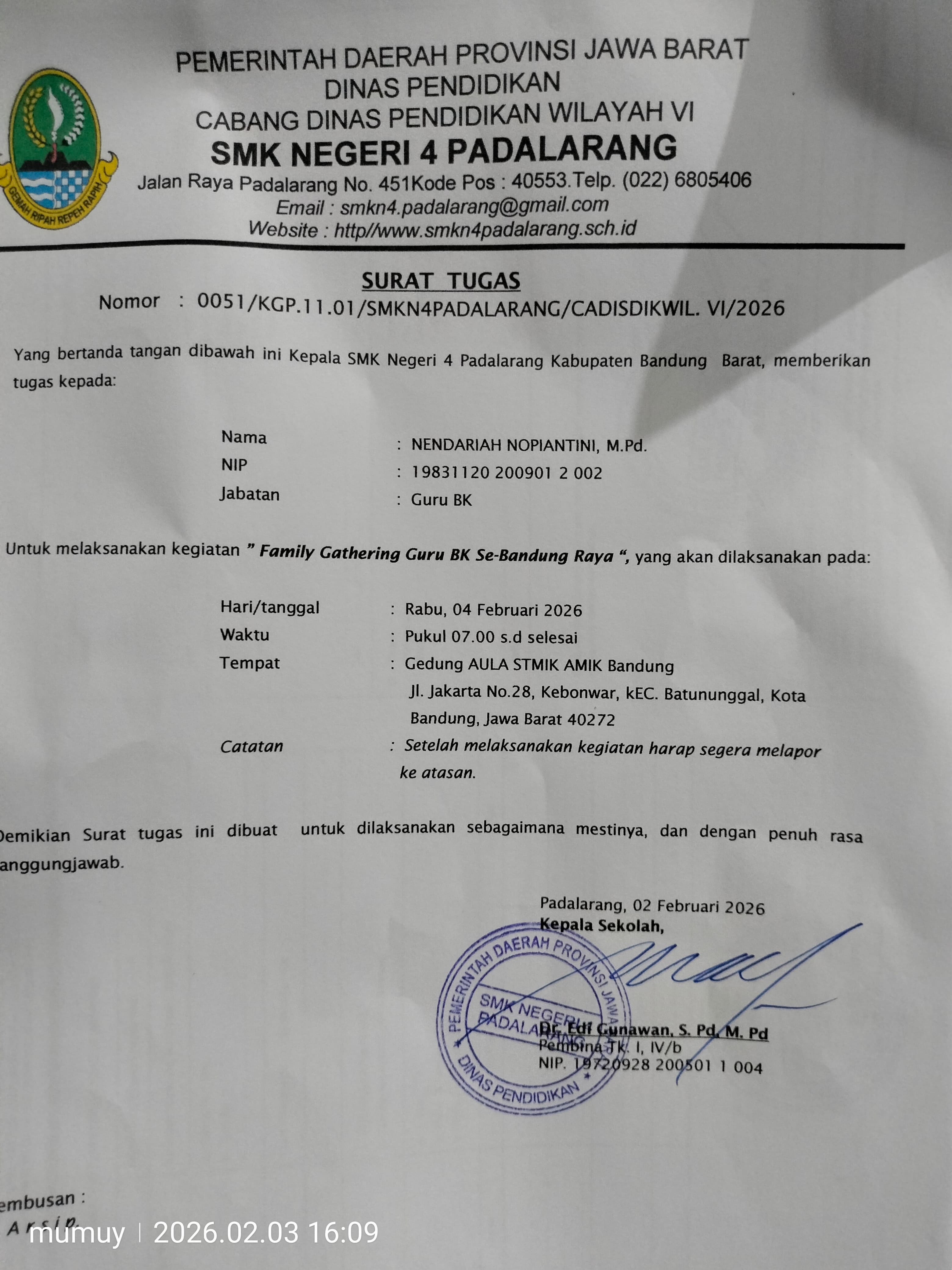 | 2026-02-04 | Nendariah Nopiantini | Rabu | Jam 11 | XI GAMELAB | Dinas Luar | Lihat |